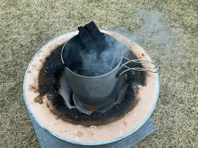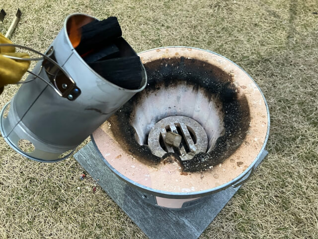 炭の片付けは、残っている火が付いた炭を火消壺に入れてふたをします。この炭は火が付きやすく次回も使うことができます。